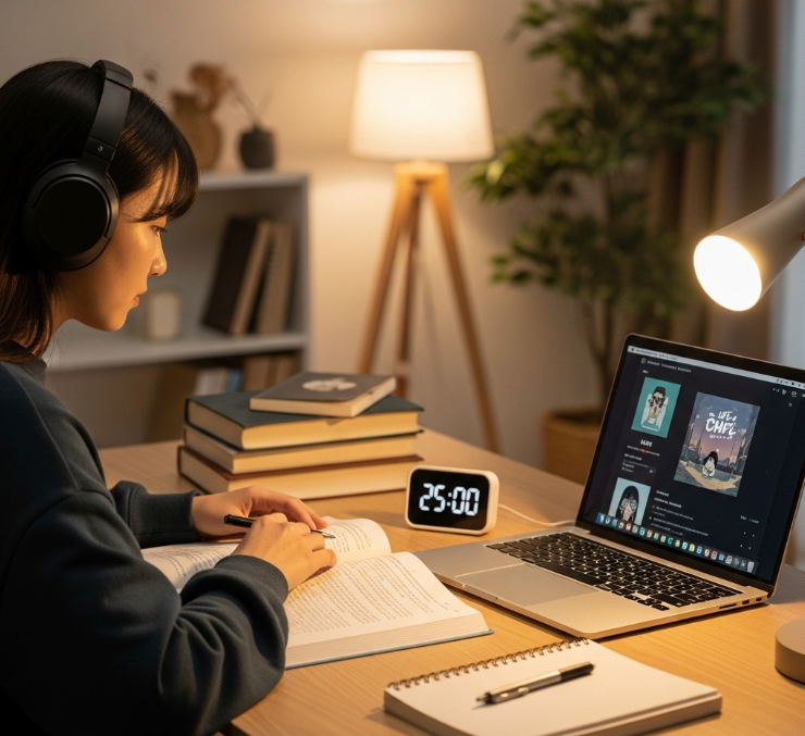 뽀모도로로 시간의 틀을 잡아도 여전히 문제가 있었습니다. 바로 '소음'이었죠. 외부의 생활 소음과 제 머릿속의 잡생각이 집중을 방해했습니다. 그래서 저는 '소리'를 활용해 저만의 몰입 공간을 만들기 시작했습니다.