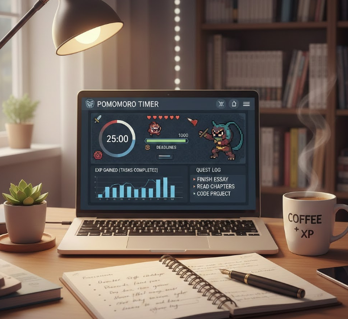 - RPG 게임화 요소 (Gamification): 뽀모도로를 수행하면 경험치와 골드를 얻고, 내 캐릭터(페르소나)가 레벨업을 합니다. 공부가 지루한 의무가 아니라 캐릭터를 키우는 퀘스트처럼 느껴지게 설계했습니다.