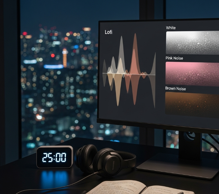 - **집중 소음(화이트·핑크·브라운)**과 Lo-fi 음악 동시 제공.